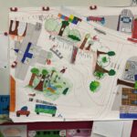 2) Élaboration d’un plan : En classe, les enfants ont travaillé en équipes pour dessiner sur le plan du quartier de l’église les éléments observés, en respectant différents thèmes imposés selon les groupes (espaces verts, circulation, animaux, matériaux). Ce travail de groupe a ensuite mené à la réalisation d’un plan géant collectif reprenant toutes les observations faites durant la visite du quartier.