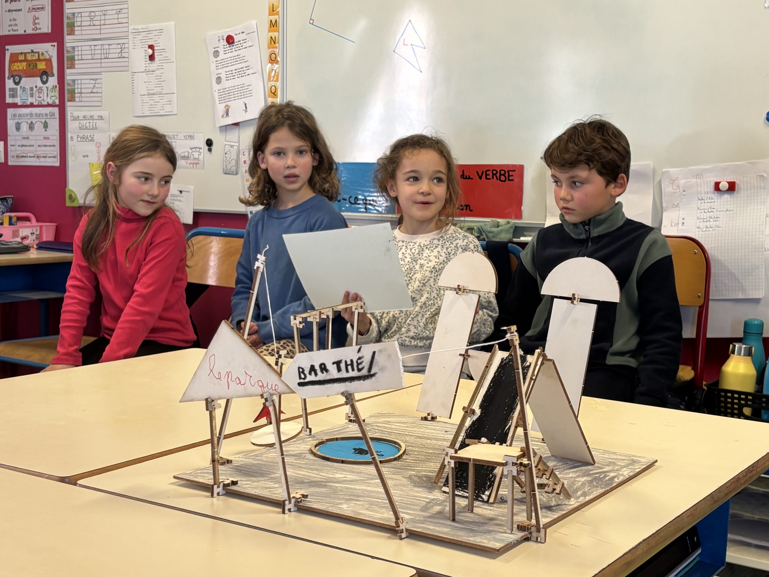 5) Présentation du projet : les enfants ont ensuite présenté leur maquette et leur projet aux camarades de la classe (nom, emplacement sur le plan, matériaux utilisés, fonction)